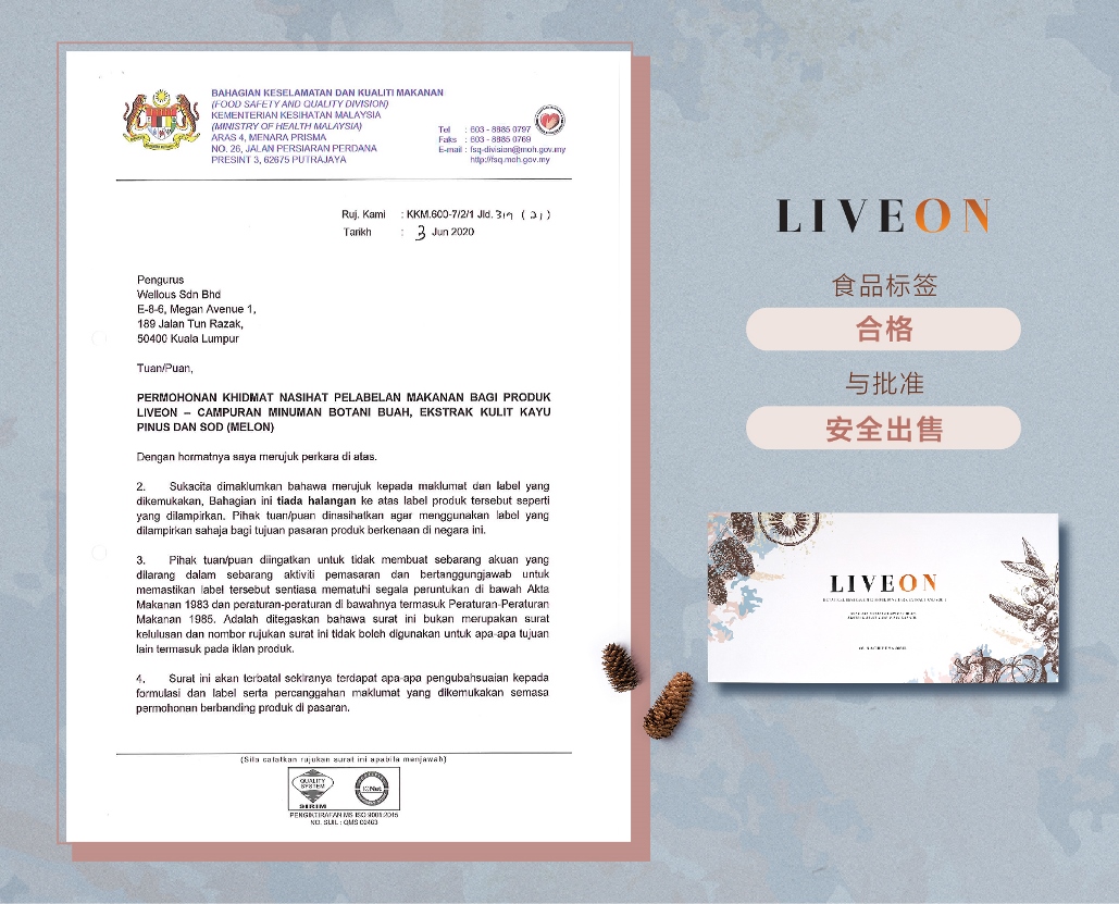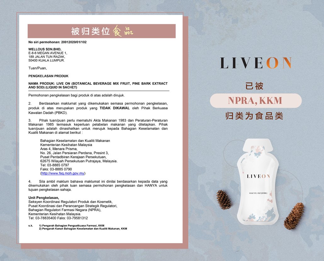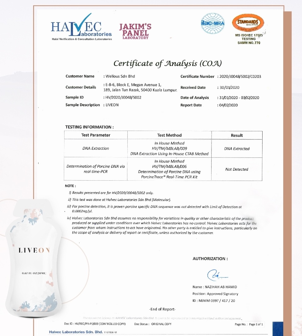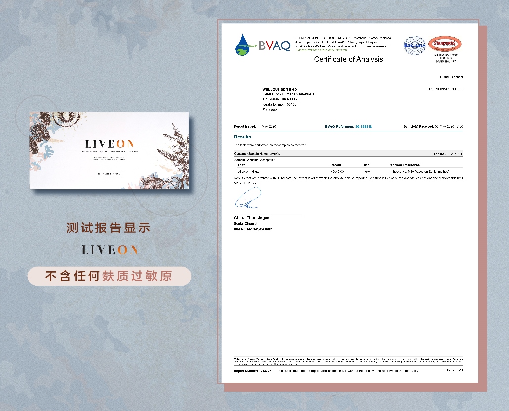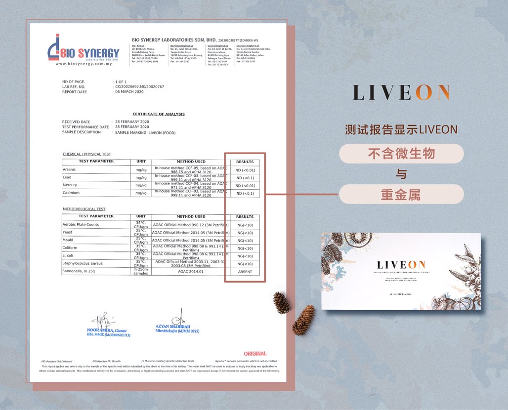 為了確保我們的LIVEON可以安全食用, LIVEON是有經過實驗室的嚴格質量檢查, 同時KKM 和 NPRA 歸類為食品類。以上是測驗報告, LIVEON 是不含微生物和重金屬, 同時也不含任何麩質過敏原。