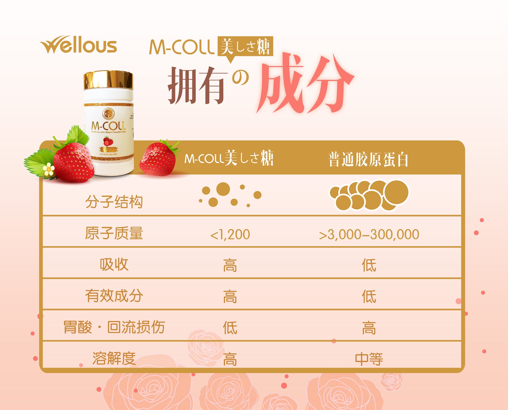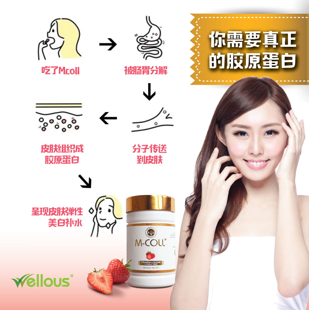 M-COLL是海洋胶原蛋白,与其他形式的胶原蛋白相比较拥有更多的优点及好处。 M-COLL与目前市场上其他胶原蛋白产品的区别就在于它的低分子量,仅有1,000道尔顿,而大多数的同类型营养补充剂则含有介于 3,000-300,000道尔顿。 相较于其他胶原蛋白,M-COLL拥有 极高的吸收率。