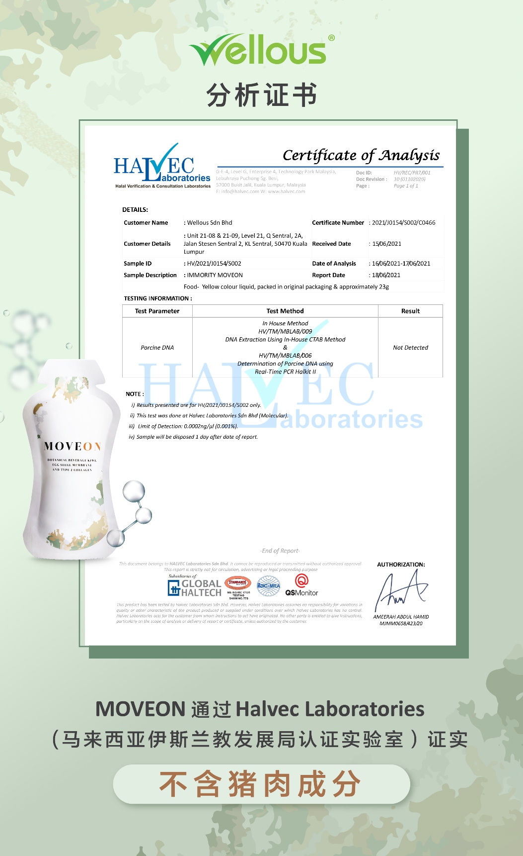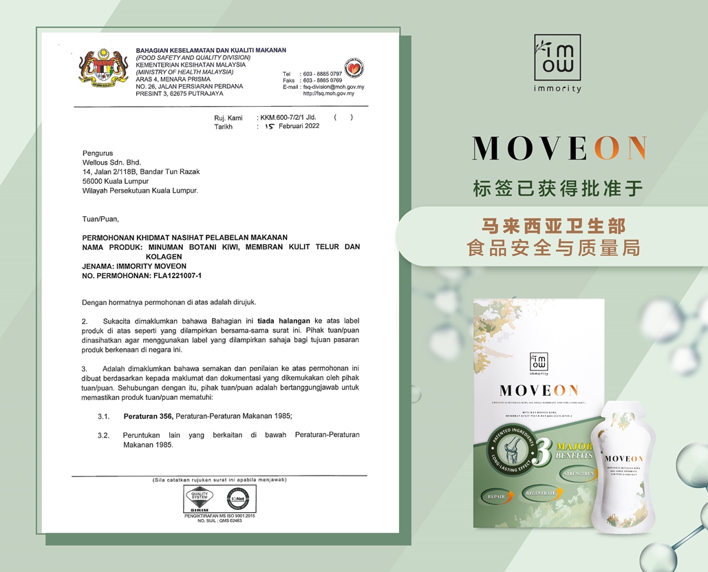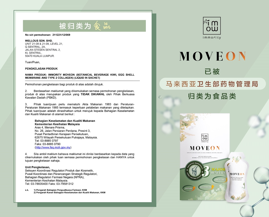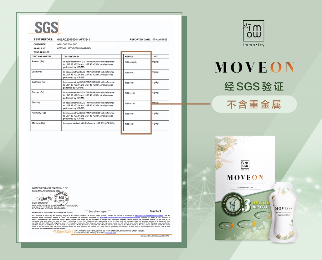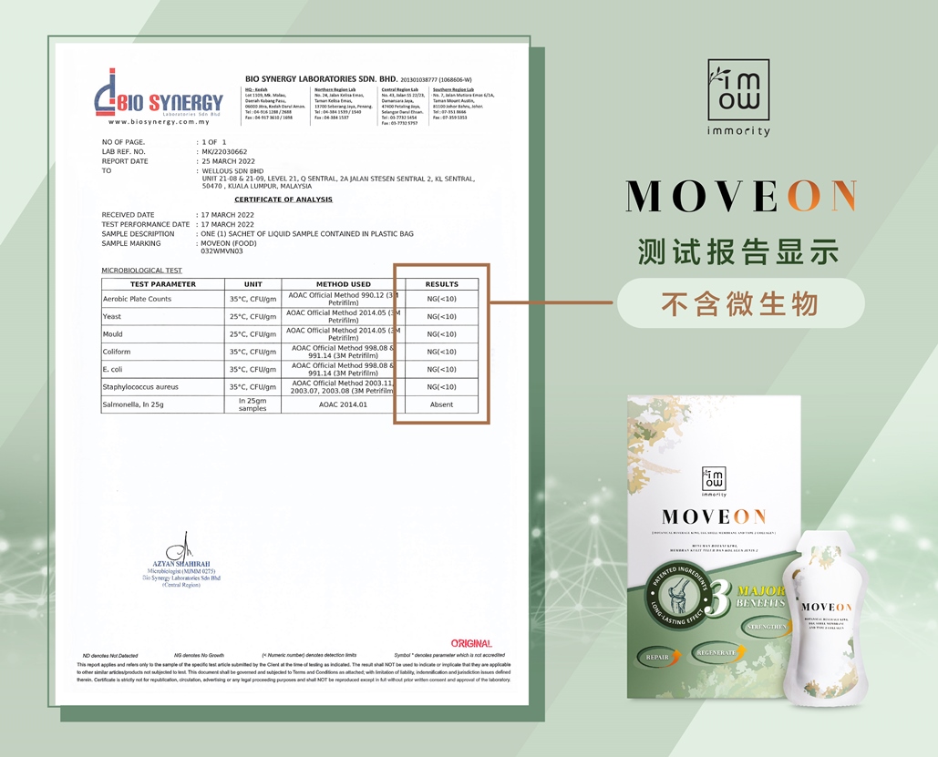 为了确保我们的MOVEON可以安全食用, MOVEON是有经过实验室的严格质量检查, 同时KKM 和 NPRA 归类为食品类。 以上是测验报告, MOVEON 是不含微生物和重金属, 同时也不含任何麸质过敏原。