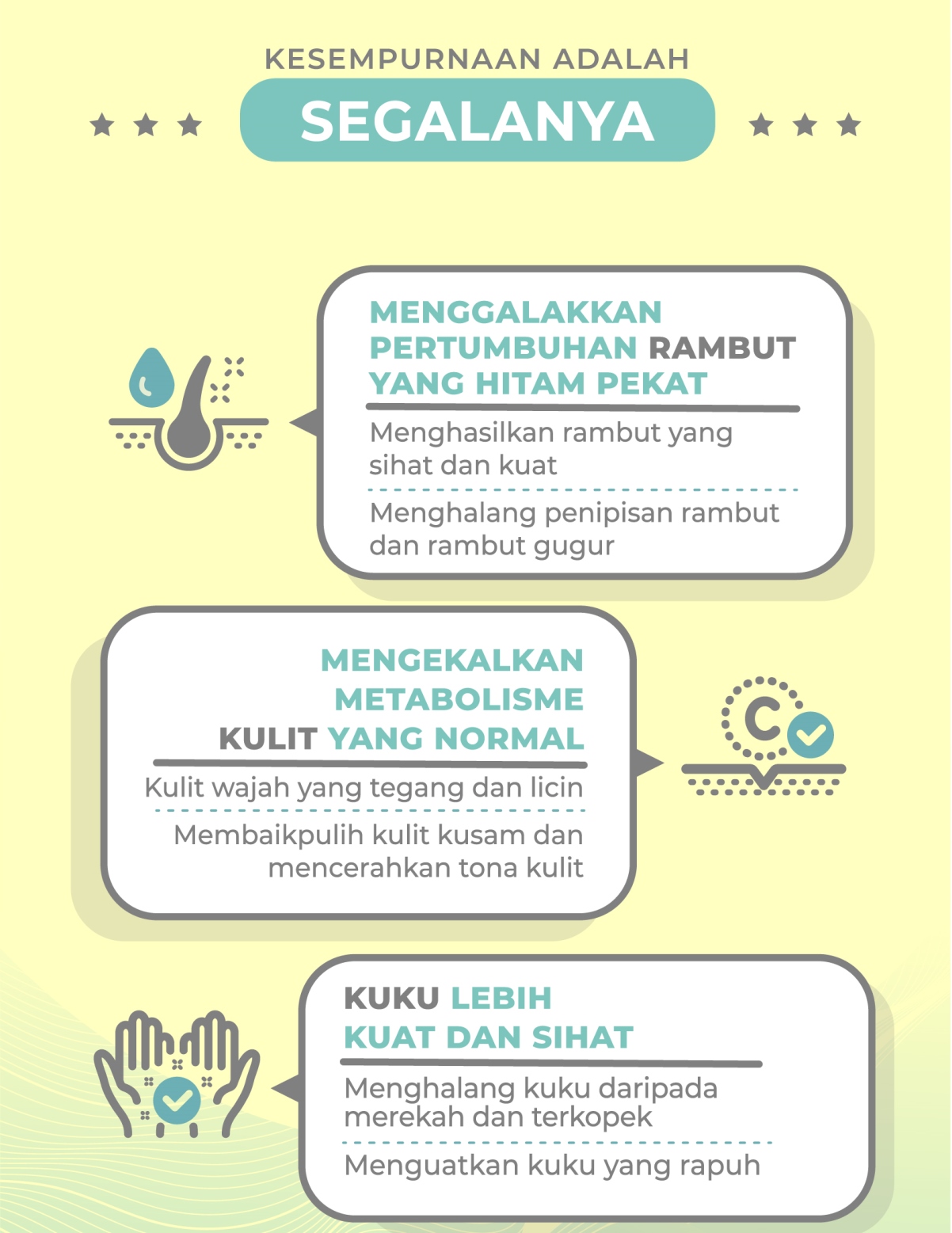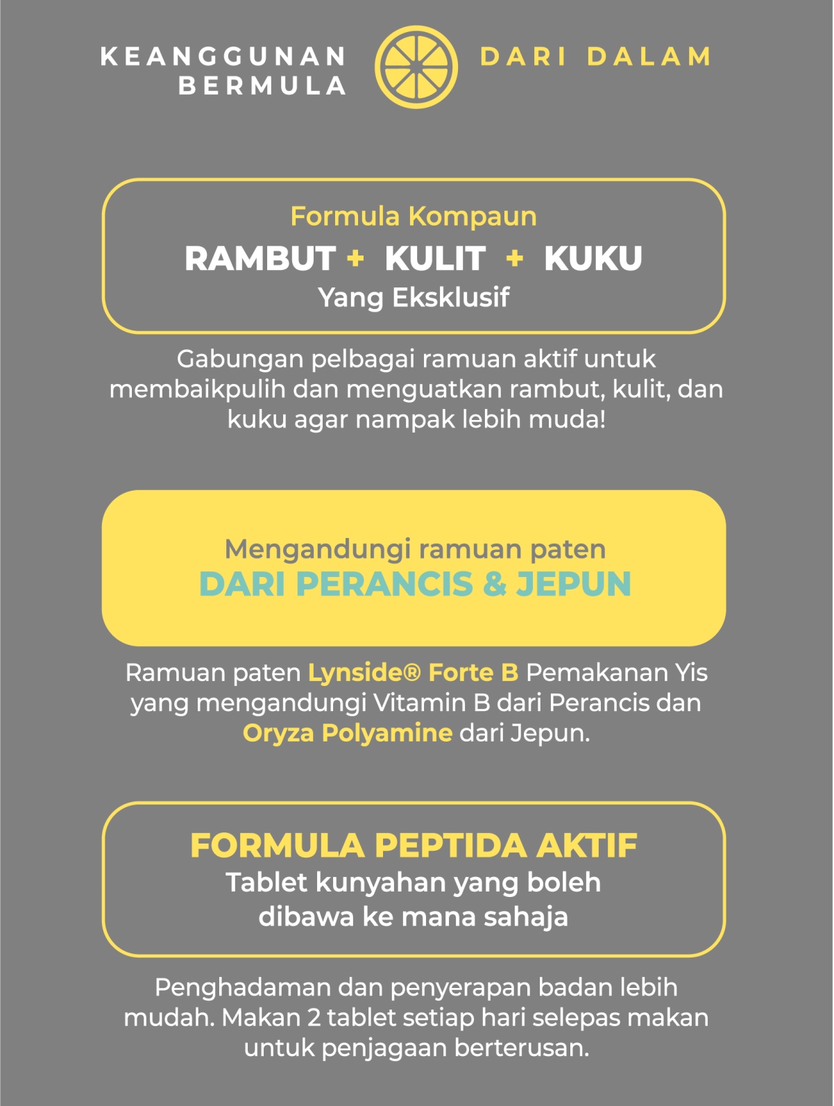 S-GLOW diperkaya dengan bahan-bahan yang dipatenkan yang mempunyai fungsi ganda. Sebagai contoh, Lynside® Forte B dari Perancis adalah ragi berfungsi yang diperkaya dengan vitamin untuk mencapai formula B kompleks dari 8 vitamin B penting yang dapat membantu memperbaiki keadaan kulit kita. Pelbagai kompleks Vitamin B iaitu Vitamin B5 untuk membantu mempromosikan penyembuhan luka kulit, Vitamin B3 yang membantu memperbaiki keadaan kulit, dan Vitamin B12 yang membantu mengawal pigmen kulit agar lebih adil. Selain itu, ramuan tersebut dapat membuat sihir pada kuku kita untuk merangsang sel kuku baru untuk tumbuh. S-GLOW juga mengandungi biotin, juga dikenal sebagai Vitamin H, yang menyumbang kepada kesihatan rambut kita.