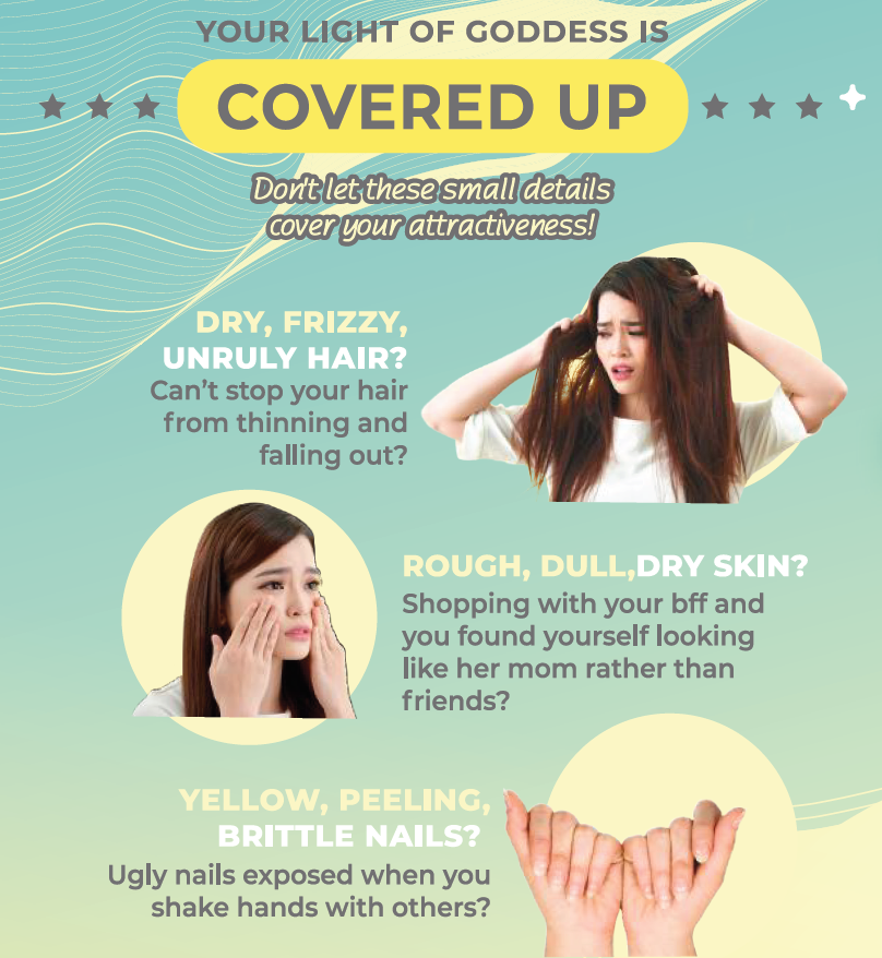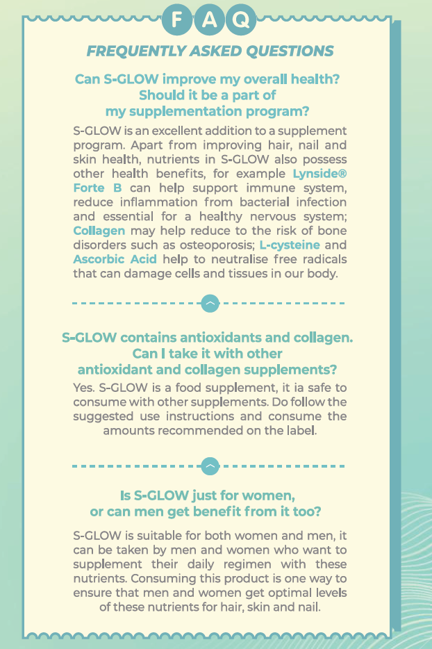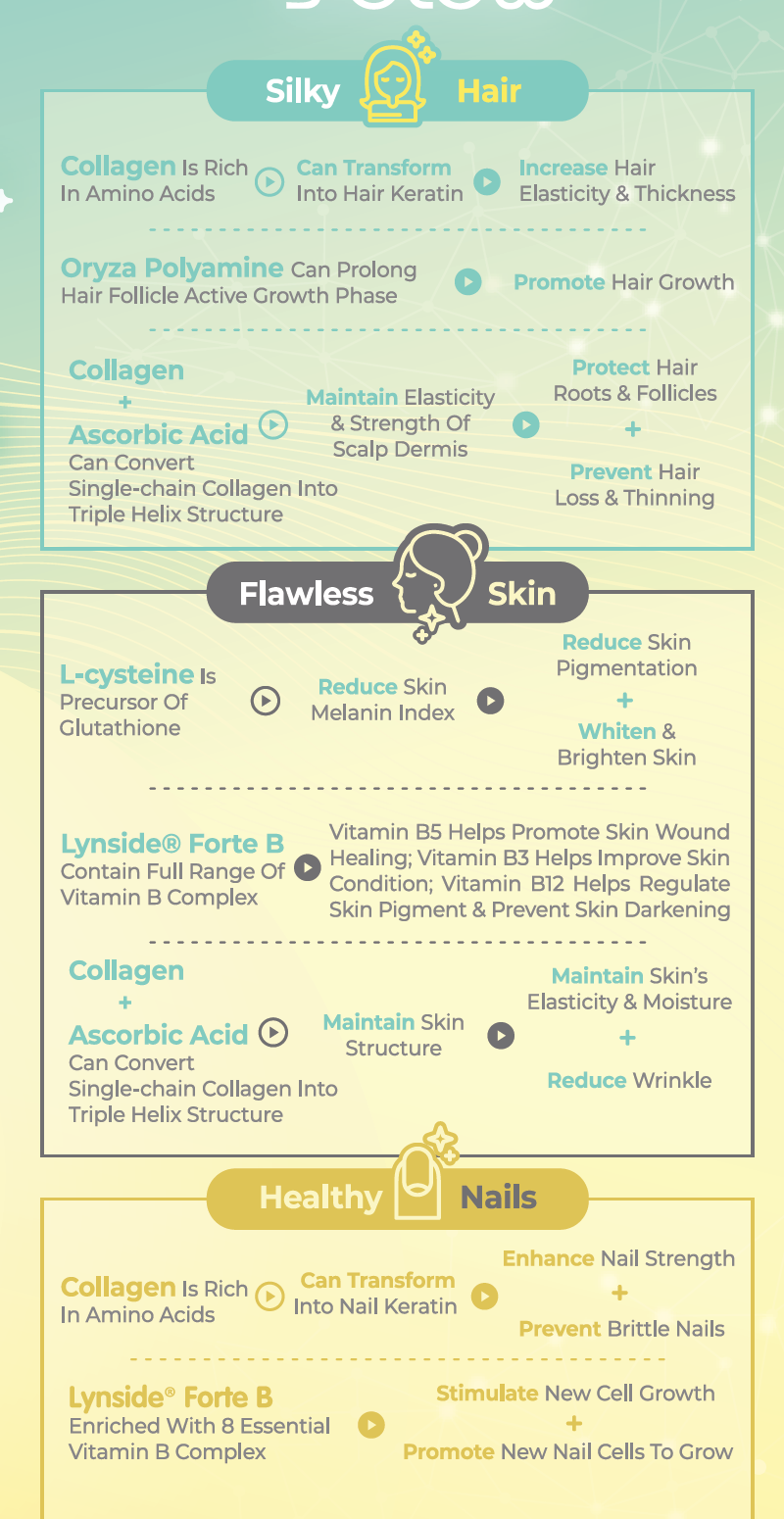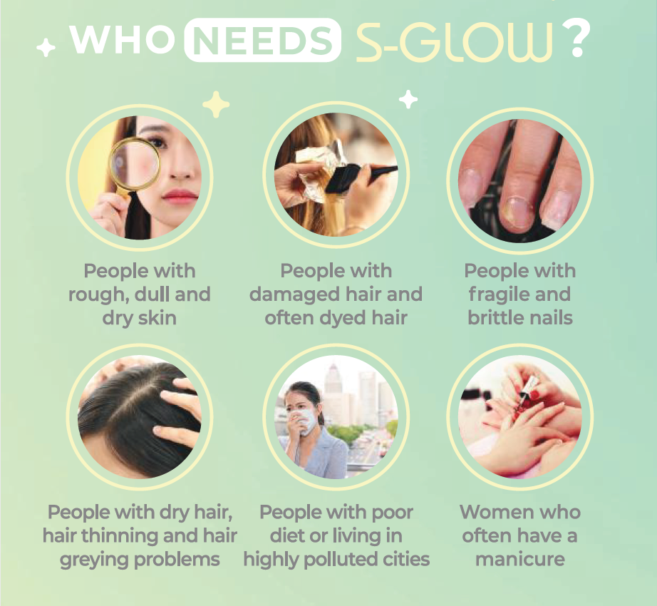 S-GLOW is enriched with patented ingredients that are multifold in functions. For instance, Lynside® Forte B from France is a functional yeast enriched in vitamins to achieve the B complex formula of 8 essential B vitamins which can help to improve the condition of our skin. The wide range of Vitamin B complex namely Vitamin B5 to help promote skin wounds healing, Vitamin B3 that helps improve skin condition, and Vitamin B12 that helps control skin pigment to make it fairer. On top of that, the ingredient can do magic on our nails to stimulate new nail cells to grow. S-GLOW also contains biotin, also known as Vitamin H, which contributes to the health of our hair.